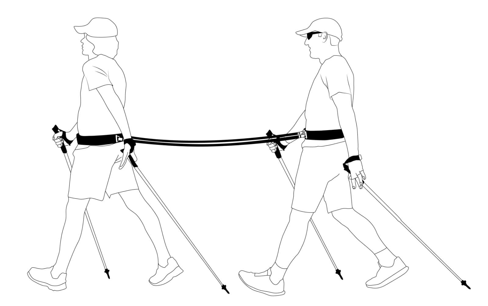 El dispositivo de guiado consta de dos cinturones unidos por dos varillas elásticas, pero suficientemente rígidas como para permitir que la persona ciega o con discapacidad visual pueda seguir los movimientos de su guía sin interferir en el desarrollo de la técnica propia de la marcha nórdica. El guía lleva un cinturón, y el deportista ciego el otro. ¿Cuál es el problema? En efecto: la distancia entre ambos es menor de dos metros. Es una distancia razonable en entorno urbano, según las recomendaciones de distanciamiento de seguridad, pero muy inferior a la recomendada por gobierno y médicos, como hemos visto, cuando se está haciendo deporte aeróbico detrás de una persona.